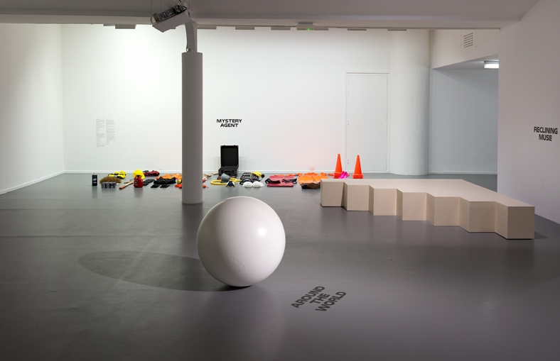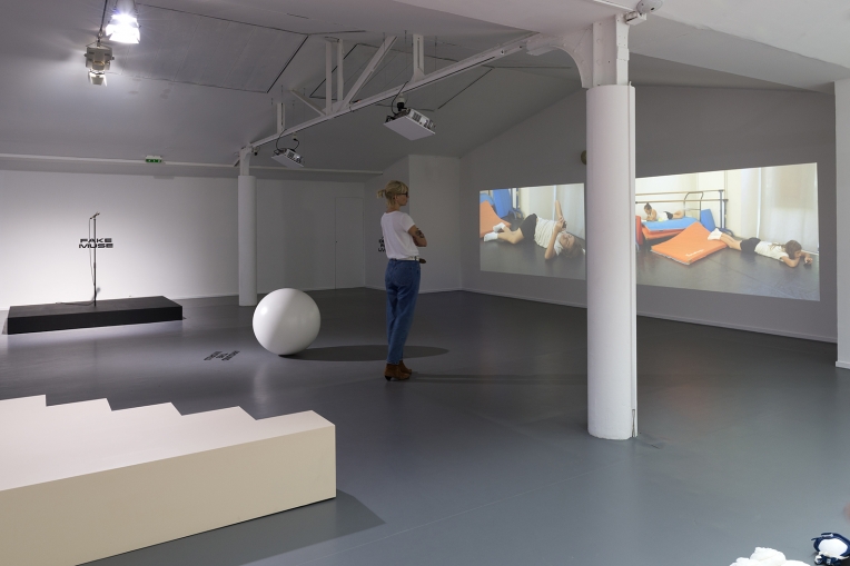 Her exhibition comprises an installation of three simultaneous video projections in which a pair of teenagers, a boy and a girl with an uncanny resemblance, act out real-life situations and sing songs. The installation includes low platforms like mini-stages inviting exhibition-goers to strike poses or sing out loud, along with various gym equipment on which to warm up and shape up one’s body. It turns out that some of these objects, designed to protect against a danger or optimize certain physical exercises, are also liable to be used dangerously, even violently. This inherent ambiguity suggests the potentially subversive ambiguities of body language.